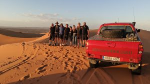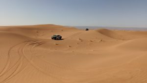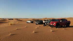 Desayuno y cinco 4×4 nos vamos a hacer las ultimas dunas por el erg Chebbi. Subimos a alguna alta pero en una cordillera se nos complica el avance en arena muy blanda que nos hace perder tiempo.