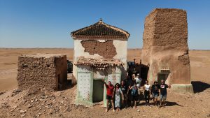 Hacemos una breve visita a un cuartel abandonado y en un albergue cercano paramos a tomar un té a la sombra de su haima. Continuamos ruta para cruzar el Draa y no nos queda más remedio que avanzar entre un mar de dunas bajas y rastrojos pero al fin, en el horizonte, divisamos las tres estructuras características del legendario Morabito de Ben Omar!