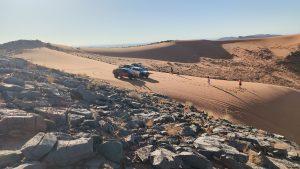 Amanece en el campamento con un poco de musiquita, desayunamos, recoger el campamento… y en marcha! Comenzamos las dunas, inclinaciones, algún salto…y seguimos avanzando.