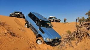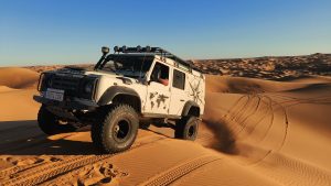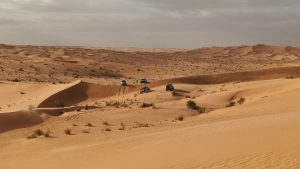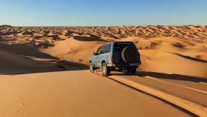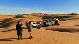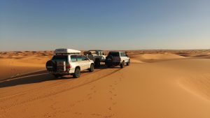 Estamos en el interior de un mar de arena inmenso, cordilleras de dunas y valles se interponen en nuestro camino. Vamos sorteando las dunas abriendo rodadas por los pasos más adecuados. El nivel de conducción es bueno y avanzamos a buen ritmo. A veces algún atasco pero nada grave que no se pueda solucionar con un eslingazo o unas planchas de arena. Al final del día cuando instalamos nuestro campamento en las dunas hemos realizado más de 100km. Ha sido una buena jornada de conducción offroad.