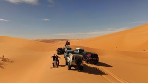 Último día de desierto, arena y dunas. Recogemos el campamento y en rumbo norte avanzamos entre un mix de dunas, llanos y alguna cordillera final. Ni un solo desyante en todo el viaje, indicador del nivel del grupo. Pasamos la mañana disfrutando de nuestra última conducción offroad en este inmenso país que es Argelia.