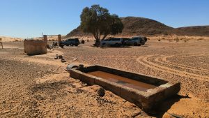 Finalizamos el cruce del primer Gemelo y llegamos a unas pequeñas montañas que separan los dos ergs y donde se encuentra un pozo de agua donde paramos a descansar en la sombra de un árbol.